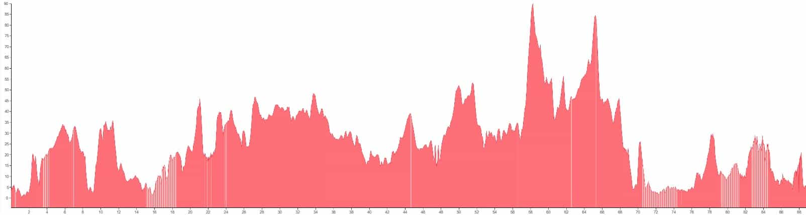 White vertical lines indicate unpaved sections or slightly rougher terrain.