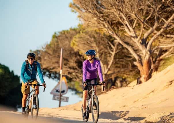Following the purpose-built cycleways, we’ll enjoy a mix of hard-packed gravel and asphalt. Through vineyard farm tracks and along the coastline, the route takes us over dirt roads, fine gravel, and solid sandy trails.