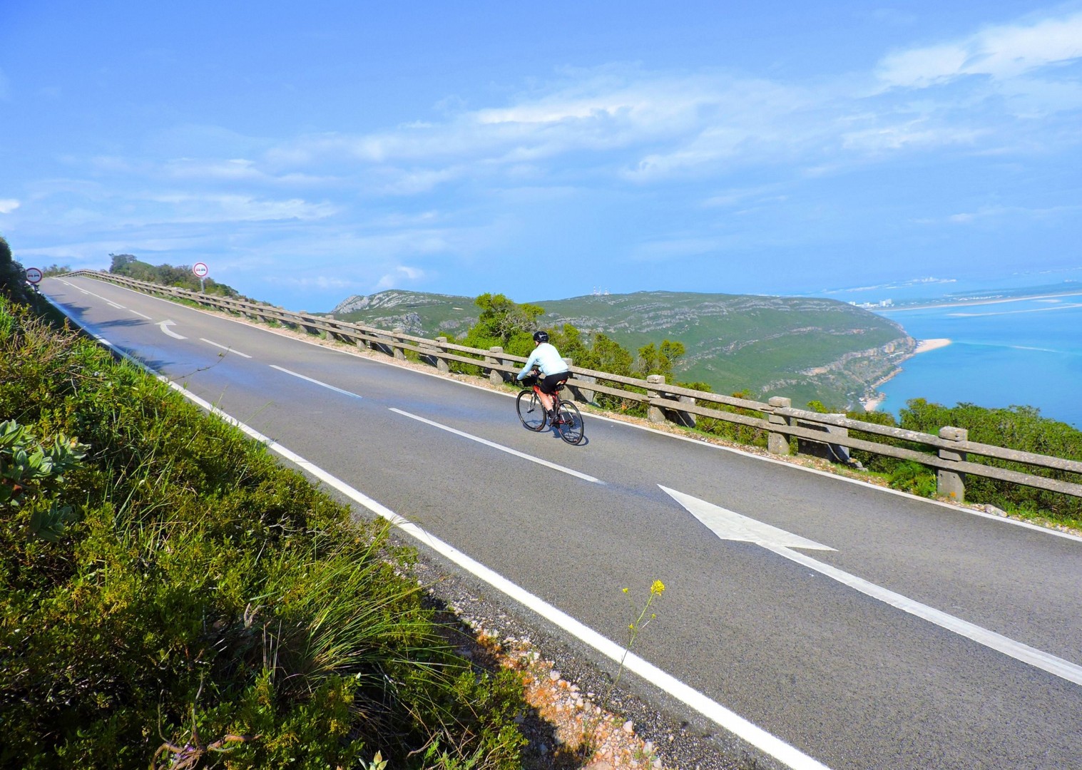 We roll out from the seaside town of Sesimbra, a fishing community wrapped around a sheltered bay beneath the high cliffs of the Arrábida mountains. A steady climb leads us to the higher ground above town, with the Serra da Arrábida, our goal for the morning, rising ahead across the Sado estuary.