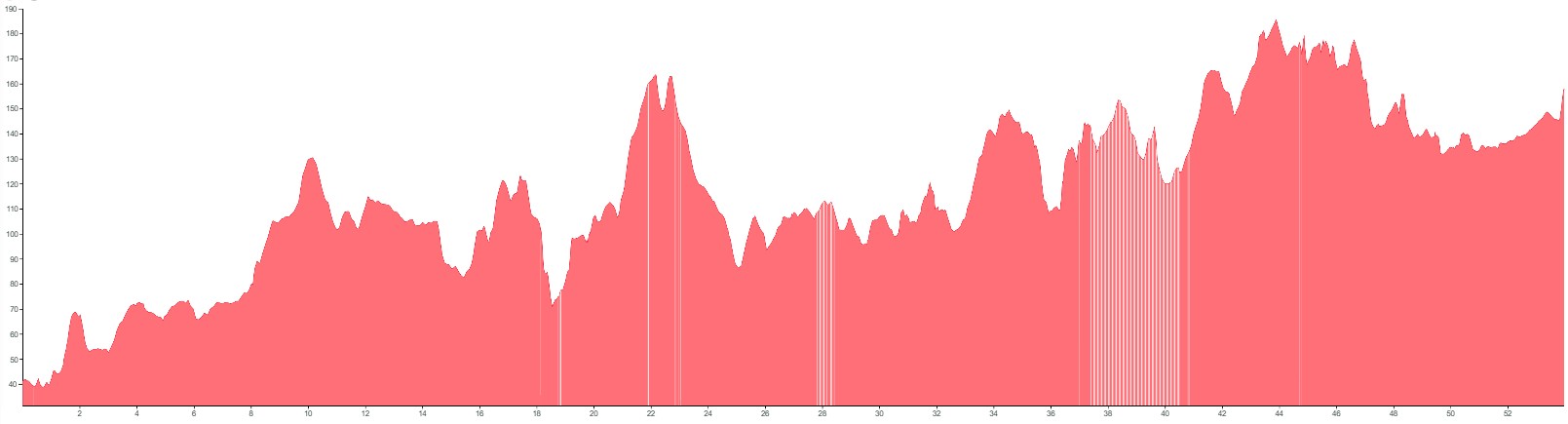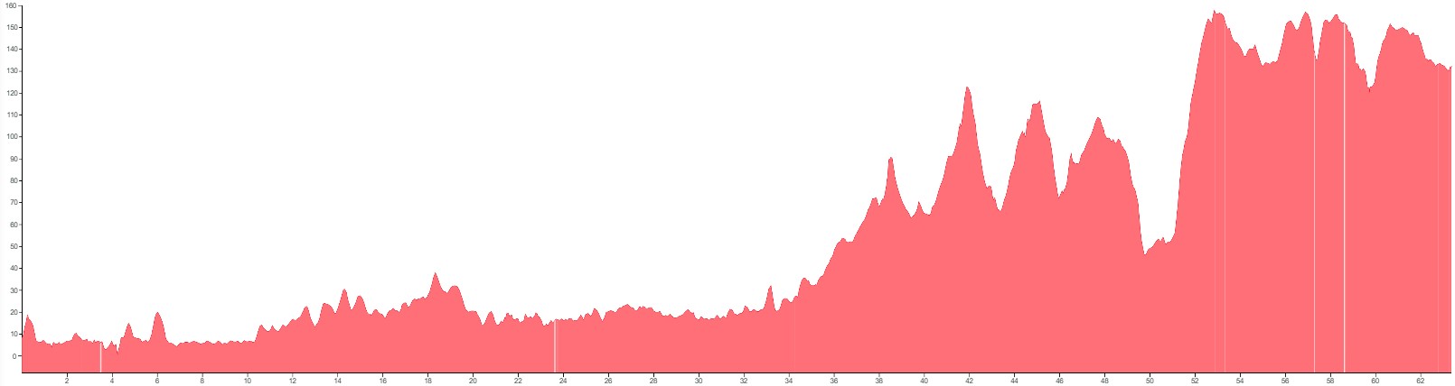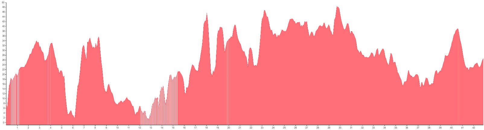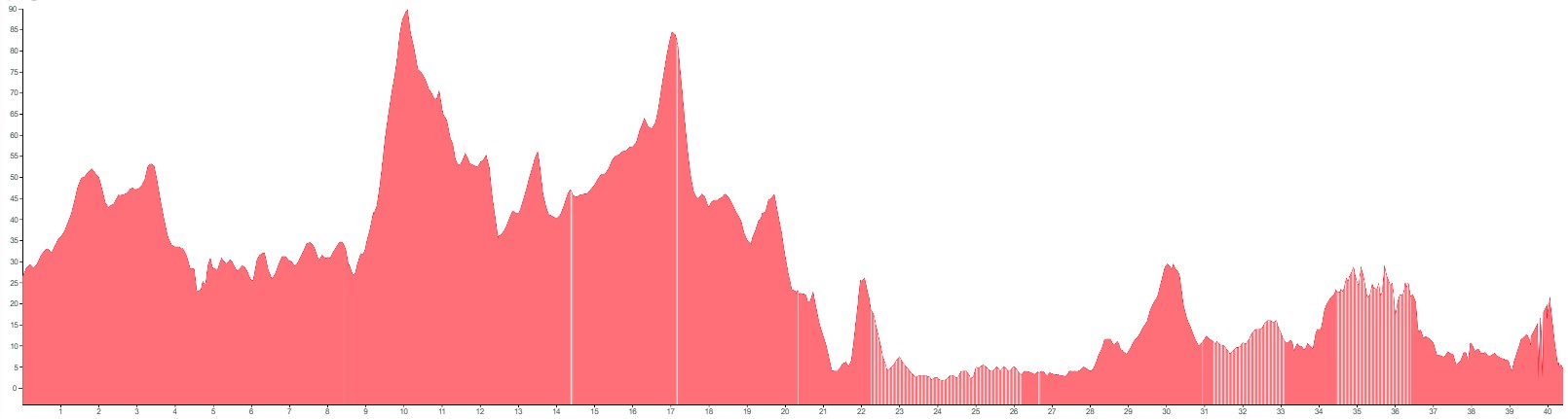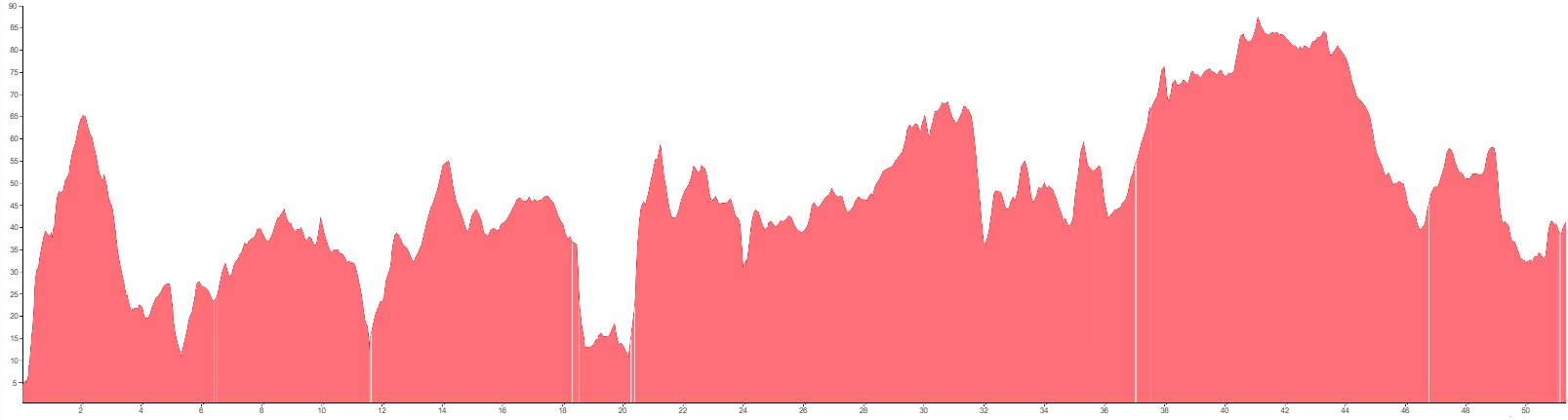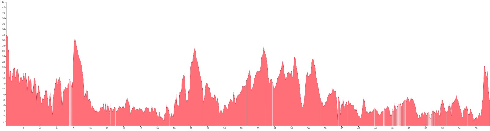 White vertical lines indicate unpaved sections or slightly rougher terrain.